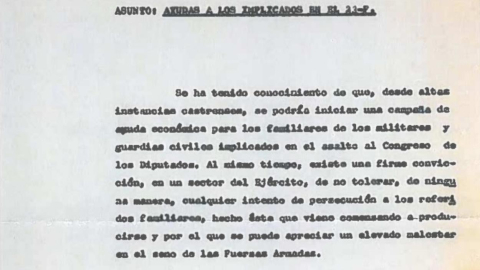Uno de los documentos más relevantes está fechado el 18 de marzo de 1981, apenas tres semanas después del asalto encabezado por el teniente coronel Antonio Tejero. Bajo el asunto “Ayudas a los implicados en el 23-F”, la nota recoge que “desde altas instancias castrenses, se podría iniciar una campaña de ayuda económica para los familiares de los militares y guardias civiles implicados en el asalto al Congreso de los Diputados”