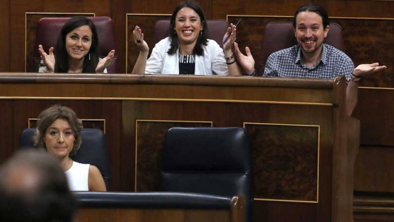 Los diputados de Unidos Podemos, Ione Belarra, Irene Montero y Pablo Iglesias, de izda a dcha, escuchan la intervención del presidente del Gobierno, Mariano Rajoy, durante la sesión de control al Gobierno, hoy en el Congreso de los Diputados.
