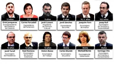 Las penas impuestas serían: 13 años para Junqueras y 12 años para los exconsejeros Jordi Turull, Raül Romeva y Dolors Bassa por sedición y malversación,; Joaquim Forn y Josep Rull son condenados a 10 años y medio de cárcel por sedición y por el mismo delito se condena a Carme Forcadell a 11 años y medio de cárcel. Los líderes sociales Jordi Sánchez (ANC) y Jordi Cuixart (Ómnium Cultural) son condenados a 9 años de cárcel.