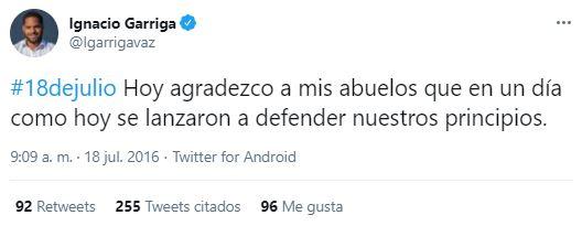 “18 de julio. Hoy agradezco a mis abuelos que en un día como hoy se lanzaron a defender nuestros principios”, escribió por aquel entonces. En ese momento, el candidato de Vox tuvo respuestas de usuarios que le criticaban defender un alzamiento militar. “No caigas en la manipulación. Celebro la lucha por la fe cristiana, la defensa de la familia, la justicia social, no el golpe”, se defendía. También proclamaba su defensa al Estado de Derecho frente a los golpistas secesionistas.
