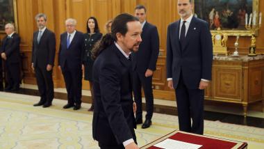 Iglesias ha sido el primero de los cinco integrantes de Unidas Podemos que se incorporan al Ejecutivo de coalición en tomar posesión de su cargo, y lo ha hecho ataviado con chaqueta y pantalón oscuro, camisa rosa, sin corbata, y con un pin del triángulo rojo invertido, que simboliza la lucha antifascista, ya que era la marca con la que los nazis identificaban a los presos políticos en los campos de concentración nazis.