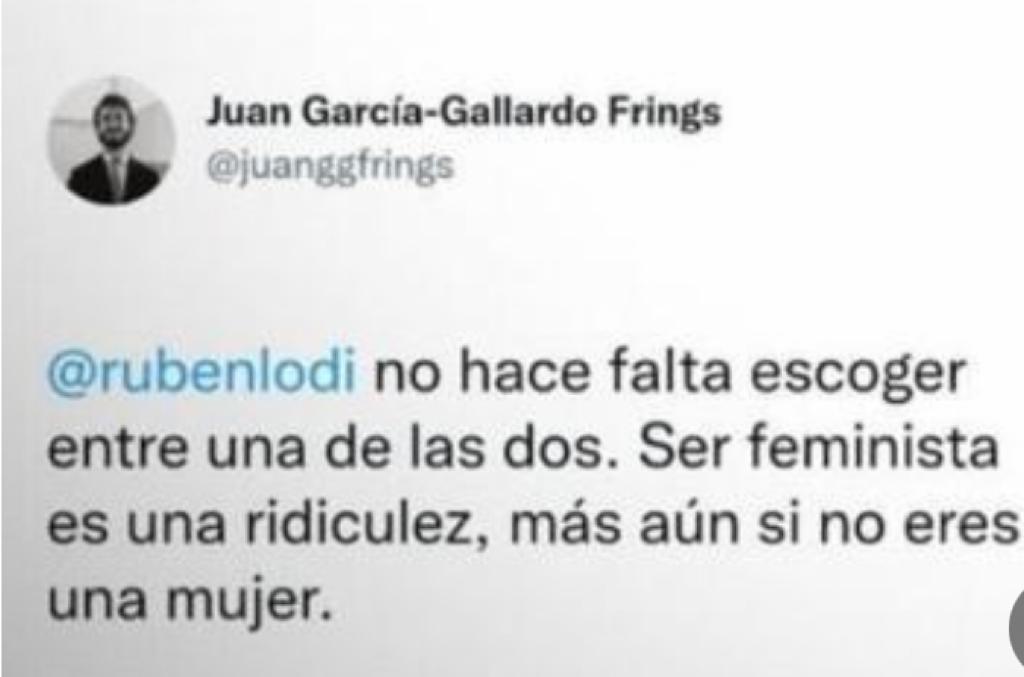 A Juan García-Gallardo Frings tampoco le gustan las "putas". El 13 de enero de 2011, una mujer siguió el pérfil del hoy líder de Vox en Castilla y León. García-Gallardo Frings se mostró contrariado: "Hoy he hecho público mi perfil de Twitter. Mi último follower es una puta. O eso parece. No sé qué hacer. Tengo miedo". Aquí la captura del mensaje que el líder de extrema derecha también ha borrado de las redes sociales.