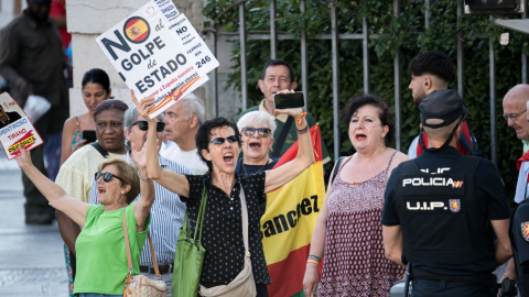 Como en cada concentración de los ultras, se han visto numerosas banderas de España y se han proferido ataques contra Pedro Sánchez y su mujer: "Pedro, tirano, qué pasa con tu hermano"o "Begoña Gómez, corrupta es". También ha habido tiempo para meter a Carles Puigdemont en el saco: "Ese furgón para Puigdemont", han gritado.
