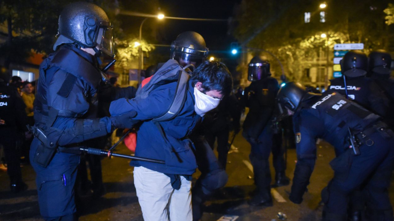 Dos de los arrestados se enfrentan a cargos por desórdenes públicos y atentado a agente de la autoridad, uno por desórdenes públicos, y los otros tres por atentado, resistencia y desobediencia a los agentes, además de amenazas. La decimosexta jornada de protestas reunió alrededor de 1.500 personas. Alrededor de las 23.00 horas, la Policía Nacional intervino con cargas contra manifestantes encapuchados y radicales en primera fila, después de que estos empezaran a patear y volcar las vallas que protegían la sede del PSOE en Ferraz.