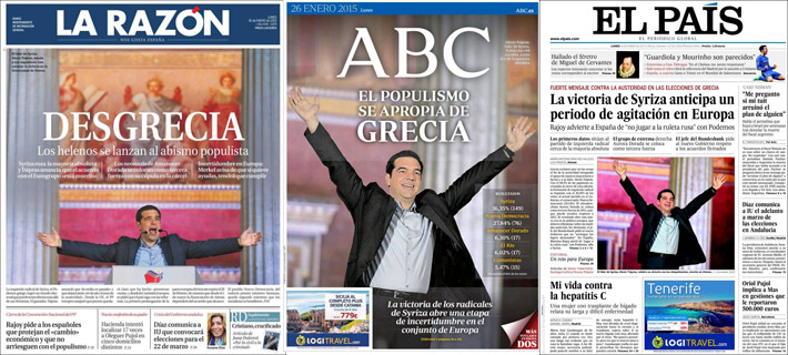 "Desgrecia". Así interpreta Francisco Marhuenda el triunfo de Syriza en Grecia. 'La Razón' alerta en su portada de cómo los "helenos se lanzan al abismo populista" tras el aplastante triunfo de Alexis Tsipras, a dos escaños de la mayoría absoluta. La misma idea copa la portada del ABC, que coincide en subrayar que "el populismo se apropia de Grecia". Ambos diarios hablan de "incertidumbre en Europa" tras la victoria de los "redicales".