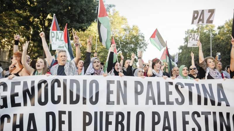 Miles de personas se han manifestado en la tarde de este sábado en las calles de Madrid para pedir un "alto al genocidio" contra el pueblo palestino y para reclamar al Gobierno de España que termine con el comercio de armas y de las relaciones con el Estado de Israel.