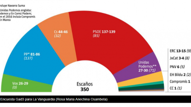 En segunda posición se quedaría el el PP, con algo más del 20% del sufragio y entre 79 y 84 escaños (dos más con Navarra Suma). El resto de fuerzas de derechas, Ciudadanos y Vox, obtendrían 46 y 29 diputados respectivamente, por lo que la suma da un total de 161 parlamentarios, cifra que queda muy lejos de la mayoría absoluta del Congreso (176).