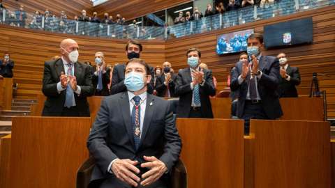 El nuevo presidente de la Junta de Castilla y León se ha dirigido expresamente al partido con el que compartirá responsabilidades de Gobierno durante los próximos cuatro años, Vox, con su presidente, Santiago Abascal, a la cabeza, con una mención a "Juan" -García-Gallardo-, desde mañana vicepresidente del Gobierno de coalición.