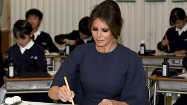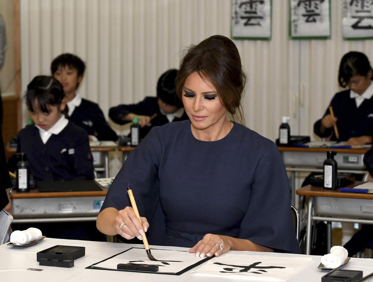 Tras una recepción con los emperadores de Japón, Melania Trump y Akie Abe se dirigieron al colegio Kyobashi Tsukiji, donde fueron recibidas en el gimnasio por unos 300 estudiantes y profesores, recogió la cadena japonesa NHK. La primera dama estadounidense saludó personalmente a varios niños, se tomó fotografías con ellos haciendo el signo de la paz y asistió a una clase de shodo, un complejo arte japonés que también se animó a probar.