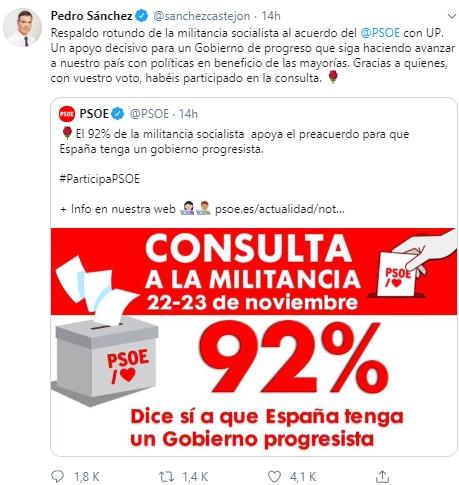 "Respaldo rotundo de la militancia socialista al acuerdo del PSOE con UP. Un apoyo decisivo para un Gobierno de progreso que siga haciendo avanzar a nuestro país con políticas en beneficio de las mayorías. Gracias a quienes, con vuestro voto, habéis participado en la consulta", ha destacado Sánchez a través de su cuenta de Twitter.
