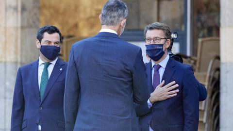 El presidente andaluz ha recordado el encuentro entre Pedro Sánchez y Pere Aragonés que se celebrará el próximo lunes y la cesión de tres nuevos impuestos al País Vasco, condición del lehendakari, Íñigo Urkullu, para acudir hoy a la Conferencia de Presidentes, cuando debería ser una "obligación" que asistiera a estas reuniones para debatir entre todas las comunidades: "Vemos con tristeza y preocupación y con cierto enfado el hecho de que a algunas comunidades se les trate mejor que a otras".