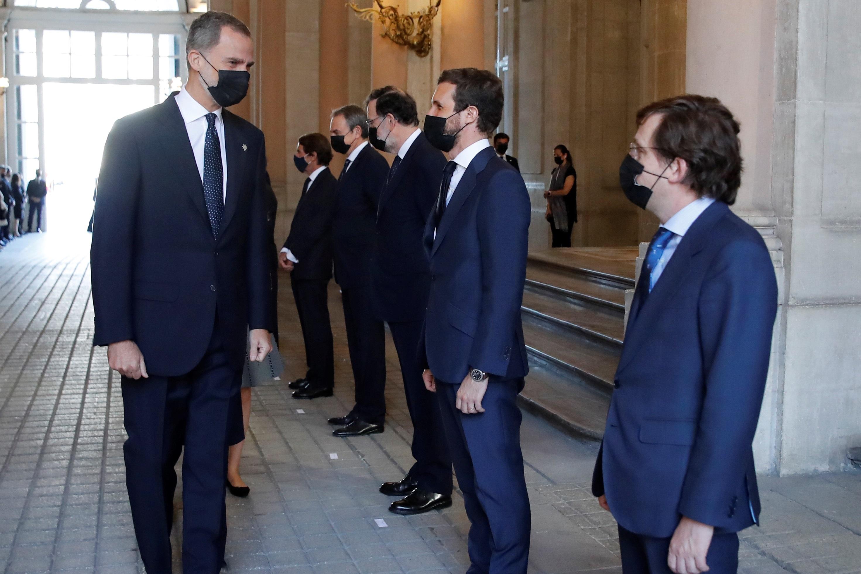 La formación liderada por Pablo Casado salió al unísono, tras el acto en memoria de los fallecidos del coronavirus, en defensa de Felipe VI. Al presidente del PP le siguieron la presidenta de la Comunidad de Madrid, Isabel Díaz Ayuso; el presidente de la Xunta de Galicia, Alberto Núñez Feijóo; y el alcalde de Madrid, José Luis Martínez-Almeida.