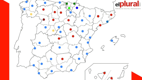 Con los resultados de las elecciones autonómicas y municipales ya cerrados, los mapas que desgranan los datos por municipio empiezan a salir a la palestra. El panorama que reflejan las capitales de provincia deja, al igual que en la perspectiva autonómica, una victoria clara para el Partido Popular.