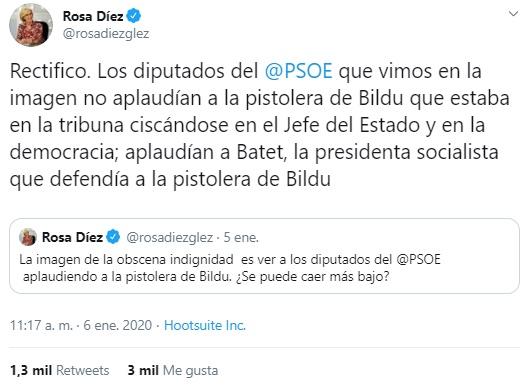 Lo que parecía ser una disculpa, no lo ha sido en realidad. Rosa Díez se sumaba al carro de otros políticos como Toni Cantó de difundir un falso vídeo de la bancada socialista durante la sesión de investidura aplaudiendo a Mertxe Aizpurua, portavoz de la Bildu. La ex del PSOE escribía en Twitter: "La imagen de la obscena indignidad es ver a los diputados del @PSOE aplaudiendo a la pistolera de Bildu", y se preguntaba: "¿Se puede caer más bajo?".