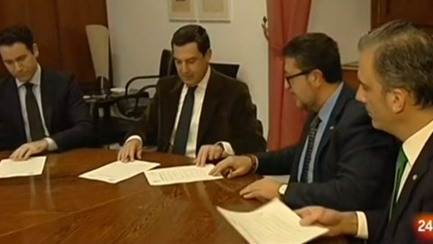 El sí de la extrema derecha al nuevo Ejecutivo de Andalucía se ha oficializado minutos después de que PP y Ciudadanos firmaran el acuerdo político por el que la formación naranja apoyará al líder del PP-A como presidente de la Junta, mientras que Moreno nombrará a Juan Marín vicepresidente de su Ejecutivo.