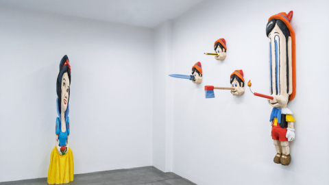 La muestra reúne esculturas en madera talladas a partir de bloques macizos. La deformación y el humor funcionan como elementos centrales de un lenguaje que interviene iconografías reconocibles y las somete a procesos de distorsión. La técnica de la anamorfosis ocupa un papel destacado, generando un juego visual que altera la percepción y plantea nuevas lecturas sobre la memoria y la imagen.