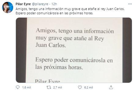 Mientras el escrutinio en Cataluña estaba a punto de sucederse y arrojar un resultado histórico y sorprendente, Pilar Eyre ponía patas arriba a todo Twitter. La periodista publicó experta en Casa Real un tuit a través del cual informaba a sus seguidores de que tenía una información muy grave sobre Juan Carlos I, aunque aún no la podía hacer pública.