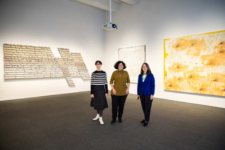 De izquierda a derecha: la cocomisaria de la exposición, Arola Valls; la directora de CaixaForum Madrid, Isabel Fuentes, y la directora de la Colección de Arte Contemporáneo Fundación ”la Caixa” y comisaria, Nimfa Bisbe, durante la presentación en CaixaForum Madrid 'Horizonte y límite. Visiones del paisaje'.