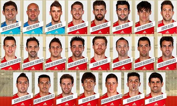Centrocampistas: Javi Martínez, Xavi, Xabi Alonso, Iniesta, Busquets, Koke, Cazorla, Mata, Silva, Pedro, Cesc.