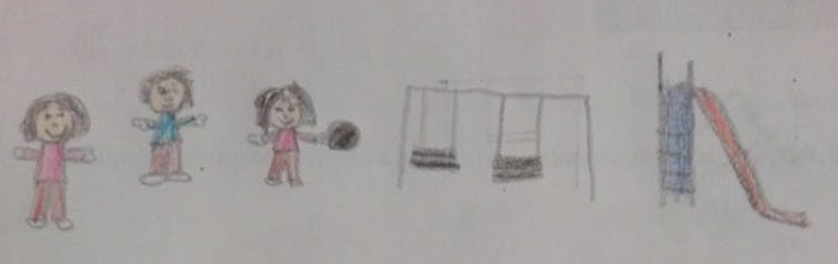 La mayor parte de los escolares se representaron a sí mismos en los dibujos jugando al aire libre, acompañados de otros niños. En las entrevistas, comentaron lo mucho que echaban de menos sus juegos, sus salidas al parque y a sus compañeros de clase. La libertad de salir a menudo a jugar al aire libre se daba por sentada antes de la crisis sanitaria, algo que podían hacer en compañía de sus iguales.