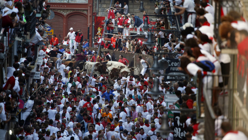 Una manada de toros de la ganadería de Fuente Ymbro, que se ha ido estirando en el recorrido hasta romperse en la calle Estafeta, ha creado emoción en el primer encierro de los sanfermines de 2016. En ELPLURAL.COM lo hemos emitido en DIRECTO.