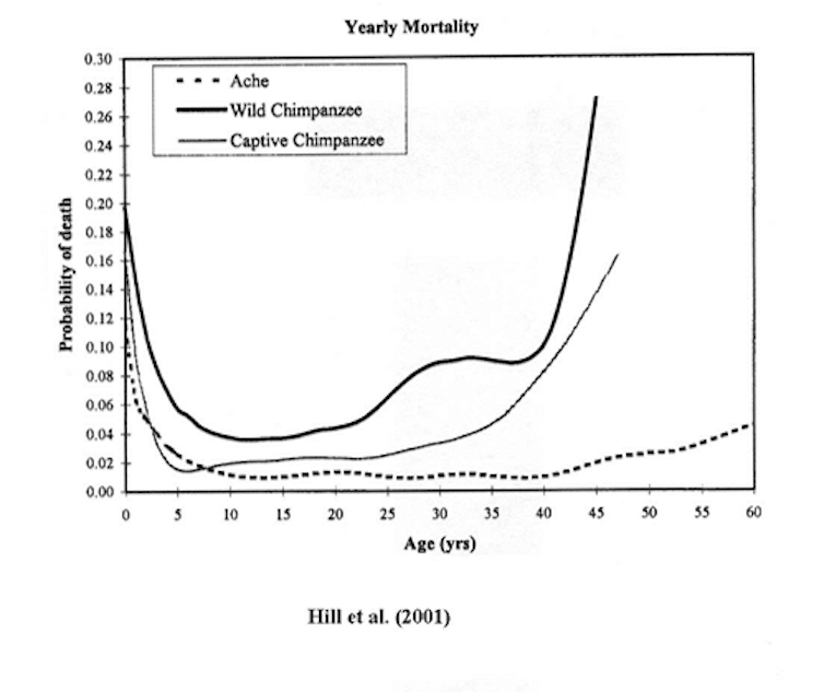 El mero hecho de que los chimpancés puedan vivir en libertad (y las hembras tener hijos) después de los cuarenta años nos debería hacer dudar de tales asertos. Porque de ninguna forma puede decirse que un chimpancé o un gorila de treinta años sea un viejo. Al contrario, está pletórico de facultades.