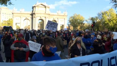 La asociación Policías por la Libertad, de reciente creación, ha organizado la tarde de este sábado en Madrid una manifestación contra la imposición de la mascarillas y la gestión que del coronavirus ha hecho el Gobierno de España.