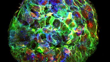 Conjunto de células de cáncer de mama empezando a despegarse de una superficie para formar un agregado esférico. En rojo observamos el citoesqueleto de actina estirando de las adhesiones al sustrato (paxilina), marcadas en verde.