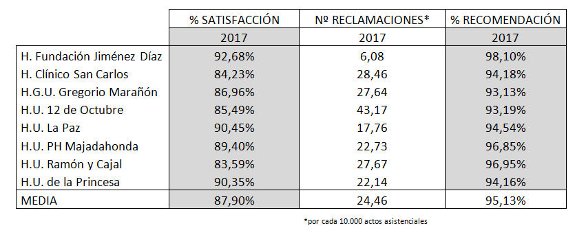 Así, en 2017 el índice de satisfacción de la Fundación Jiménez Díaz se situaba en el 92,68%, 4,7 puntos por encima de la media de su grupo y a más de 2 puntos por encima del segundo, La Paz. Por su parte, el índice de reclamaciones era del 6,08 por cada 10.000 actos asistenciales, 18,38 reclamaciones menos que la media del grupo de hospitales de alta complejidad y 11,68 menos que el segundo, La Paz. Por último, obtiene la puntuación más alta en cuanto a recomendación, un 98,10%, 3 puntos por encima de la media y 1,15 puntos por encima del siguiente, en esta caso, el Ramón y Cajal.