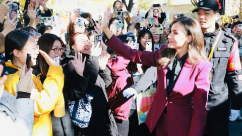 Durante su visita a la Universidad de Lenguas Extranjeras la reina destacó entre los estudiantes de español la ‘letimania’, los cuales le rodearon con un mar de móviles que dejaban constancia de la visita de la Reina y a su vez, de su estilismo.