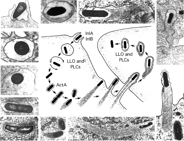 L. monocytogenes puede invadir las células. Para eso tiene una proteína en su superficie que se denomina internalina que, al unirse a otra proteína de la célula, promueve una cascada de reacciones entre la bacteria y la célula que acaba en la entrada del microorganismo. Se forma así una vacuola o fagosoma en el interior de la célula que contiene la bacteria en su interior.