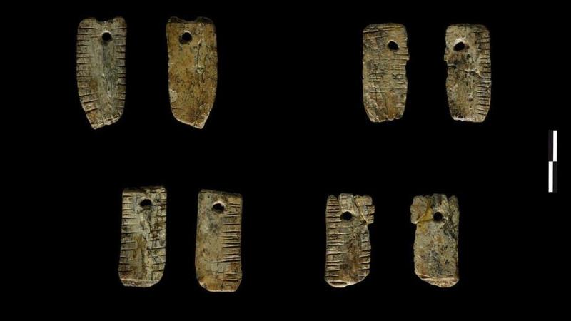 Un colgante de unos 30.000 años, encontrado en Gorge d’Enfer (Francia), presenta muescas en paralelo en sus bordes. Estas se interrumpen por la rotura de la pieza, tanto en la cabeza de colgadura como en la parte inferior, pero parece presentar unas 60 incisiones.