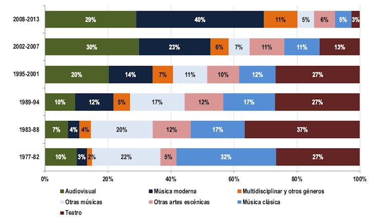 Estas variaciones, como se puede ver en el gráfico -extraído de mi tesis doctoral “La gestión de festivales en tiempos de crisis”-, explican claramente el cambio de tendencia en el nacimiento de festivales según el género artístico producido entre los primeros años de la democracia, cuando el 59% de los festivales nacidos eran de música clásica y de artes escénicas, y el periodo comprendido entre finales de los 90 y hasta los años de la crisis económica, cuando un 69% de los eventos artísticos recién nacidos eran de música moderna y audiovisuales.