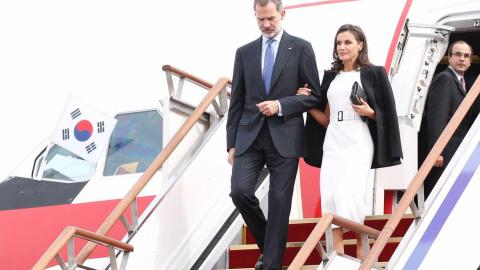 La Reina Letizia ha dejado ya atrás su look espectacular de este martes en la ceremonia de entronización de Naruhito, nuevo emperador de Japón, y ha optado por un vestido más austero para su aterrizaje, junto a Felipe VI en Corea del Sur.