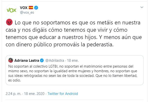 El escrito está acompañado de varios mensajes homófobos vertidos por parte de varios dirigentes de la formación ultraderechista, e incluso desde la cuenta oficial de Vox. Mensajes en los que se acusa a estos colectivos LGTB de introducir “contenidos sexuales” en los talleres de sensibilización o “promover la pederastia”, entre otros vituperios.