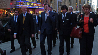 leyenda Rajoy fumándose un puro en NY. A su derecha camina el embajador español en Washington, Ramón Gil Casares. A su izquierda le acompañan su jefe de gabinete Jorge Moragas y su responsable de prensa Carmen Martínez Castro. Foto: Pixel y Dixel: Jonan Basterra