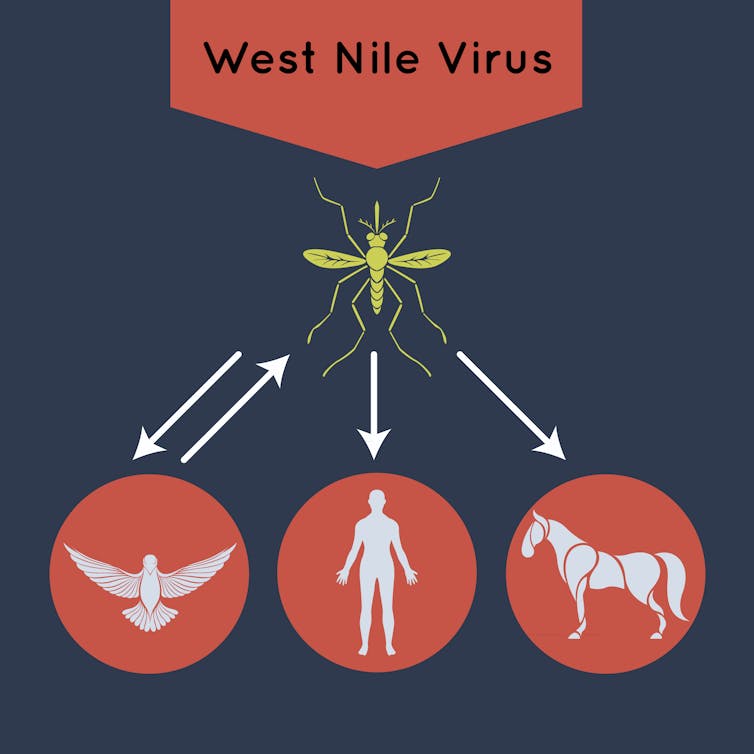 Las aves son esenciales en el ciclo biológico de WNV, pues en ellas el virus se replica hasta niveles muy elevados, de forma que circula por su sangre en grandes cantidades. Cuando un mosquito pica a un ave infectada, hay muchas posibilidades de que al chupar la sangre se lleve también virus y los inyecte al picar al siguiente animal: ave, caballo o persona.