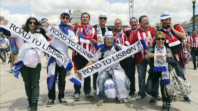 Seguidores del Real Madrid y del Atlético de Madrid se fotografían juntos en Lisboa, antes de la final de la Liga de Campeones que enfrentará a sus equipos. EFE