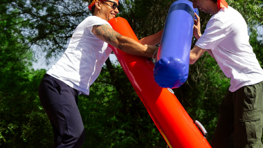 La mejor parte del Humor Amarillo en Madrid es que está pensado para todos. Aunque mencionemos la parte física, no es necesario estar en plena forma para participar. Incluso si la coordinación no es tu punto fuerte, la diversión está garantizada: podrás saltar, correr, golpear obstáculos y hasta lanzarte al agua con la deslizadora en la modalidad acuática. Da igual si eres principiante, tienes experiencia o simplemente buscas pasar un buen rato, porque Humor Amarillo en Madrid consigue que todo el mundo disfrute al máximo. Además, la actividad se adapta a grupos muy variados: desde despedidas de soltero hasta celebraciones familiares, pasando por empresas que organizan eventos para fomentar la unión entre sus equipos.