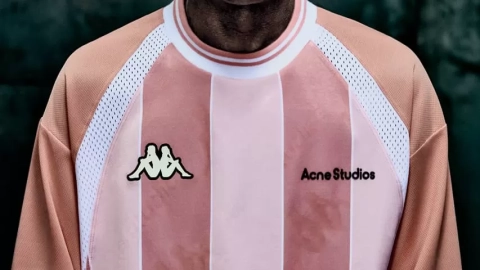 Inspirada en los uniformes retro, la colección destaca por sus camisetas con estampado de llamas en el característico rosa pastel de Acne Studios, pantalones de mezclilla de lavado claro y chándales con la cinta de logo de Kappa. También incluye tops ajustados que recuerdan las capas base de los jugadores y el bolso Bolina, presentado en la pasarela SS25 de la marca.