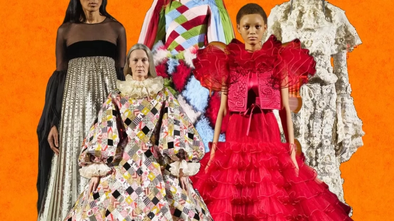 La colección fusionó referencias históricas con elementos teatrales, destacando faldas voluminosas inspiradas en el siglo XVIII, volantes setenteros y detalles caprichosos como un vestido con patrón de arlequín. Esta propuesta maximalista y ecléctica marcó una desviación del romanticismo minimalista de su predecesor, Pierpaolo Piccioli.