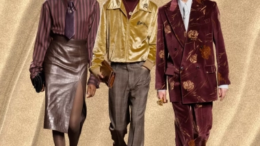 Las prendas, confeccionadas en cuero, terciopelo y satén, destilaron lujo otoñal. Abrigos de cuero con cinturón, pantalones acampanados y camisas de punto se complementaron con gafas que recordaban al estilo de Tom Ford. Por primera vez, Amiri presentó su colección femenina junto a la masculina, destacando piezas como un vestido dorado brillante con una blazer de cuero envejecido o un traje de rayas plateadas en lamé.