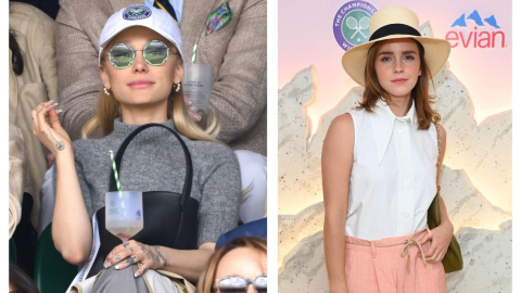 En el mismo evento, Watson optó por un enfoque más casual y chic del estilo tradicional de Wimbledon. Llevaba una camisa blanca sin mangas con un cuello retro de gran tamaño, pantalones de cintura alta plisados en color melocotón, un sombrero beige de ala ancha con un detalle de cinta de grosgrain negra y una bolsa de hombro color caqui. La actriz completó su atuendo con el mismo par excéntrico de tacones Toy de Loewe que los de Grande, pero en color blanco.