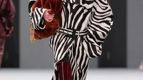 A pesar de la inspiración relajada, el glamour característico de Balmain siguió brillando. Rousteing presentó piezas impactantes como un abrigo de estampado cebra, un mono cargo, prendas de cuero trenzado y un vestido peplum de rayas con leggings tipo stirrup, reafirmando su dominio en la moda de noche.