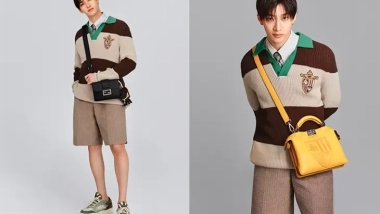 En su primera campaña como embajador, Bang Chan luce un look de la colección masculina Primavera/Verano 2025. El conjunto combina elegancia y frescura con un jersey de rayas marrón y beige, pantalones cortos de jacquard y accesorios distintivos como los bolsos Peekaboo y Baguette Double.