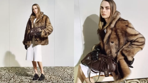 La colección de Miu Miu para el otoño 2024, diseñada por Miuccia Prada, abarca una variedad de arquetipos de vestimenta de diferentes etapas de la vida, desde abrigos con cuello Peter Pan hasta trajes de almuerzo y chaquetas de piel de oveja. Delevingne luce piezas clave como un abrigo de piel de oveja sobre un vestido camisa y una chaqueta corta de camionero con jeans ajustados. La campaña también presenta nuevos accesorios, incluyendo el bolso Aventure y el bolso de hombro Joie, ambos reviviendo diseños archivados.