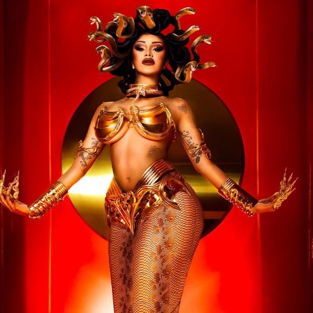 Cubriéndose de pintura corporal amarilla para imitar al conocido personaje de Los Simpson, Cardi B llevaba un elegante vestido negro con un sexy recorte que mostraba sus nalgas. El disfraz era un guiño al difunto diseñador Thierry Mugler, pero en realidad era una imitación de la obra del artista AleXsandro Palombo. La imagen en cuestión fue creada por el artista pop italiano en 2013 como parte de su serie, Marge Simpsons Style Icon, según ArtNet News.