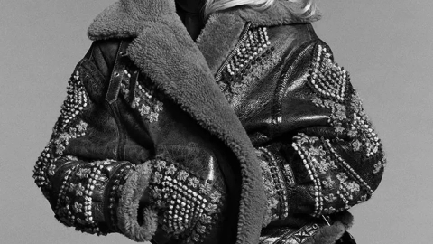Claudia Schiffer luce piezas destacadas como un shearling bordado y un cárdigan masculino grueso. La colección se caracteriza por sus formas anatómicas y chaquetas esculpidas, celebrando la artesanía incomparable de la moda italiana. Cada prenda combina lujo con elegancia casual, reflejando la estética sofisticada pero accesible de Ermanno Scervino.