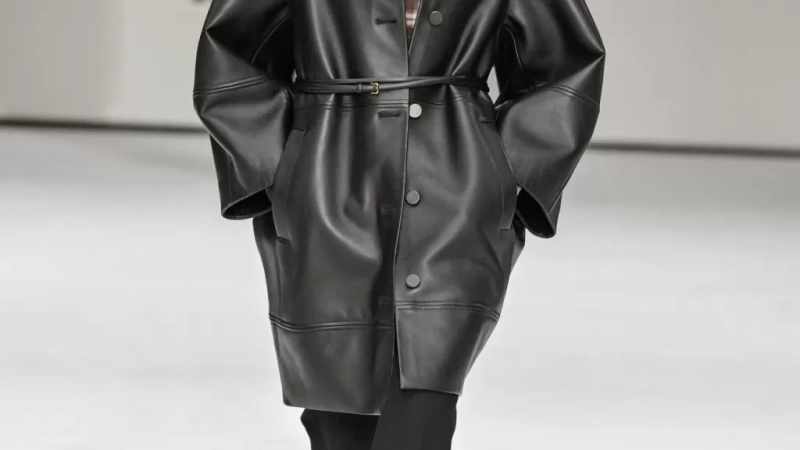 La mezcla de lo suave y lo estructurado marcó el hilo conductor de la pasarela: conjuntos de satén arrugado, vestidos drapeados y capas fluidas que se alternaron con chaquetas de cuero y abrigos envolventes de cuello alto. Todo ello acompañado de un calzado práctico y versátil —zapatillas de ante, mocasines y botas tipo calcetín de piel— pensado para la mujer y el hombre cosmopolitas que viven en constante movimiento.