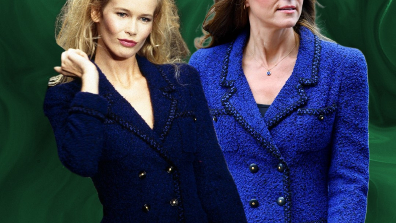 La nueva Princesa de Gales vestía una chaqueta Chanel vintage de tweed azul cobalto con adornos y botones negros de 1995, que fue modelada por Claudia Schiffer en la pasarela en ese momento. La chaqueta se vende al por menor por más de 6000 libras en Farfetch.